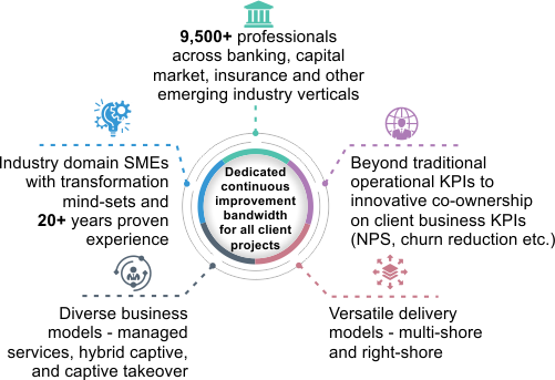 We deliver seamlessly efficient industry middle office services, back office operations and customer contact solutions – for highly regulated industries. Our new age transformation solutions bring the right blend of digital and emerging technologies – with the right and refined governance models.
