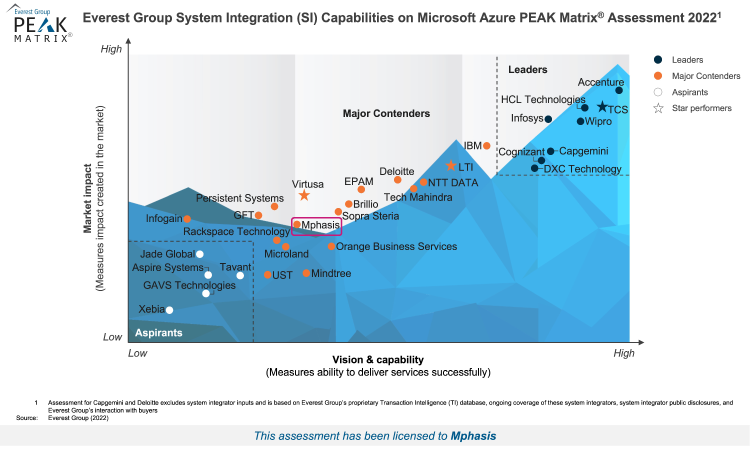 Enterprises are increasingly adopting public cloud due to increased hyperscaler services and System Integrator (SI) investments in hyperscaler-specific cloud service and solution portfolios. Everest Group positions us as a Major Contender for our strong System Integration capabilities, delivering high market impact and making targeted investments in Azure-specific talent development, delivery capabilities, and partnership ecosystem.